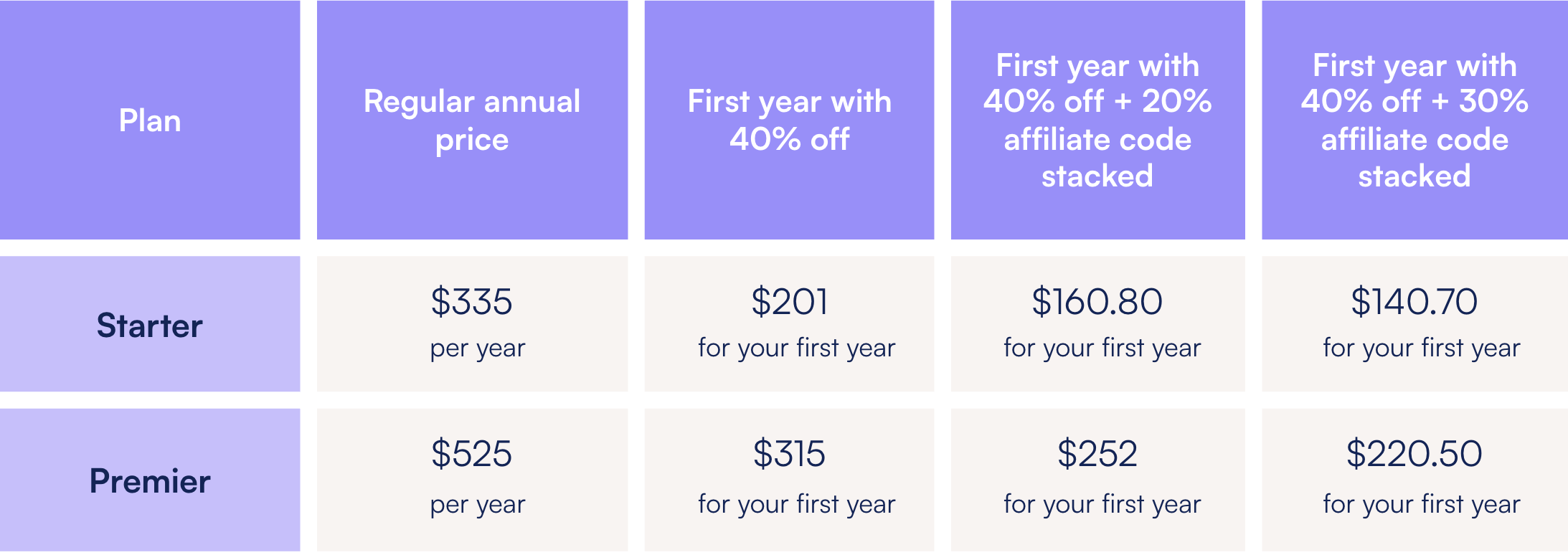 Stacked affiliate discounts are calculated sequentially, example: Starting with the original Premier plan price of $525/year, a 40% sale discount brings the price down to $315. If a 20% off affiliate discount is then applied to the sale price, resulting in a final first-year cost of $252. That’s a total savings of $273, or 52% off the regular first-year price.