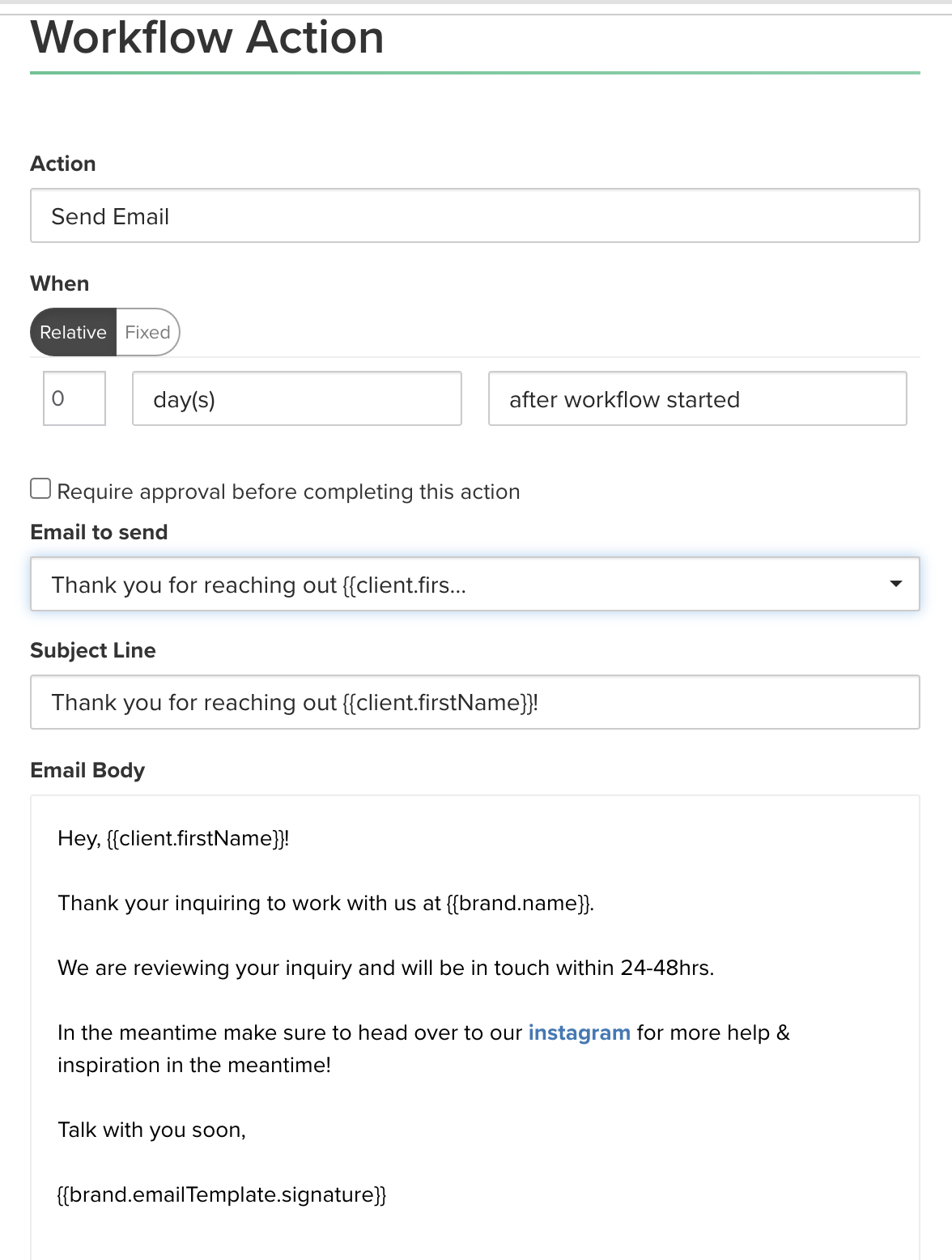 Step 1: When a lead comes in, Dubsado will automatically send them an inquiry canned email. Trust me, this little time-saver will make your life so much easier!