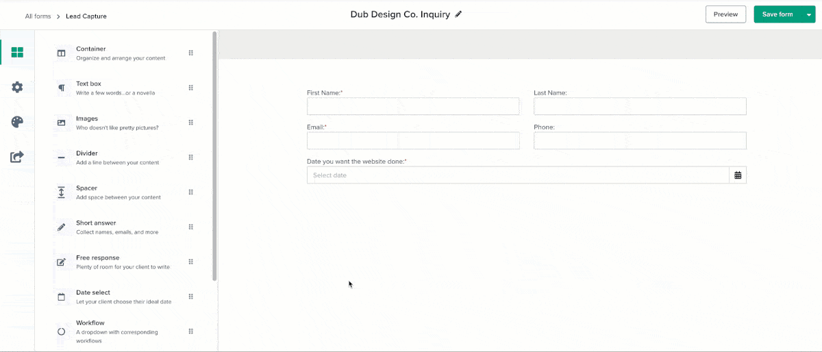 Build your lead capture form first. Your lead capture form is how new client info gets saved into Dubsado as a project. Without the form, there’s nothing for the workflow to trigger from. If you haven’t created one yet, start there.