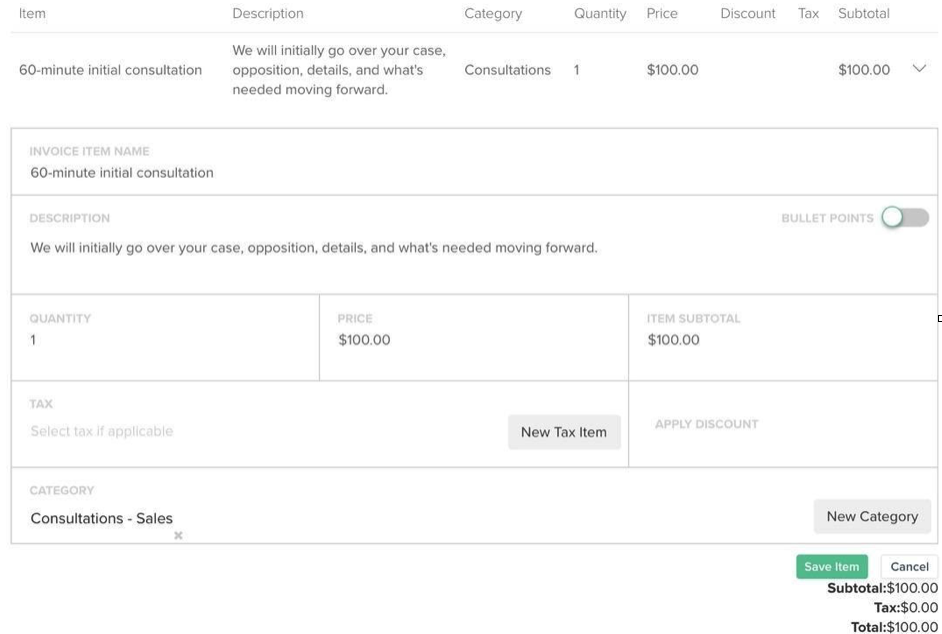 First set up a package in Dubsado [How to set up packages] . For example, a lawyer may want to charge for the initial consultation, and they could set up a package like this: