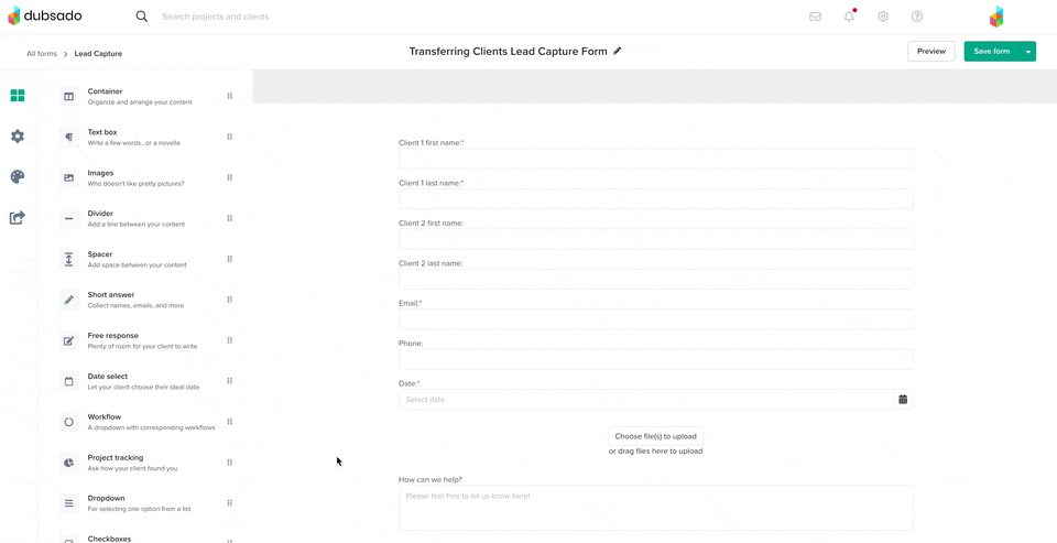 Input the client and project information into your Dubsado lead capture form and press SUBMIT. You will upload completed forms to these projects at a later step.