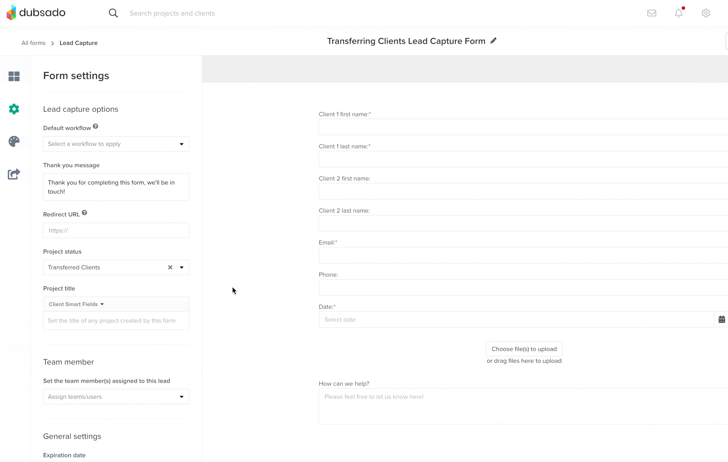 Input the client and project information into your Dubsado lead capture form and press SUBMIT. You will upload completed forms to these projects at a later step.