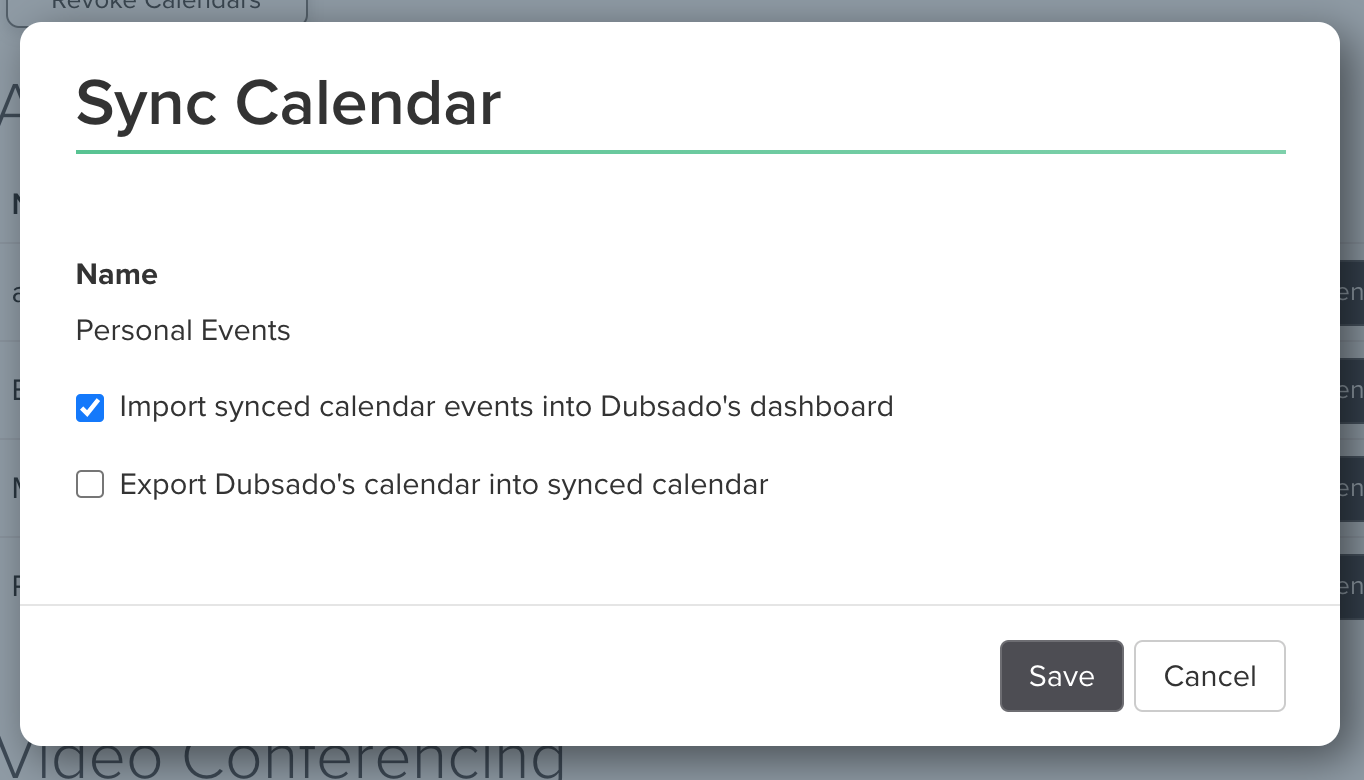 Once you link an available calendar, it will appear under Synced Calendars. You can click on a synced calendar to adjust its import and export settings.