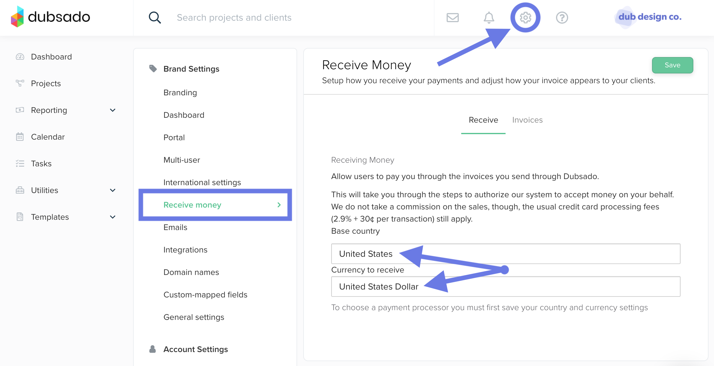 The Receive Money tab in the settings is where you will connect your payment processor. A payment processor allows your clients to pay you right on the invoices you send from Dubsado!